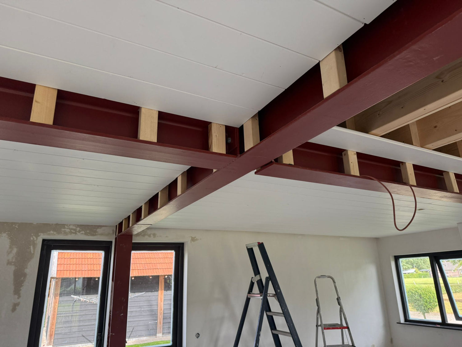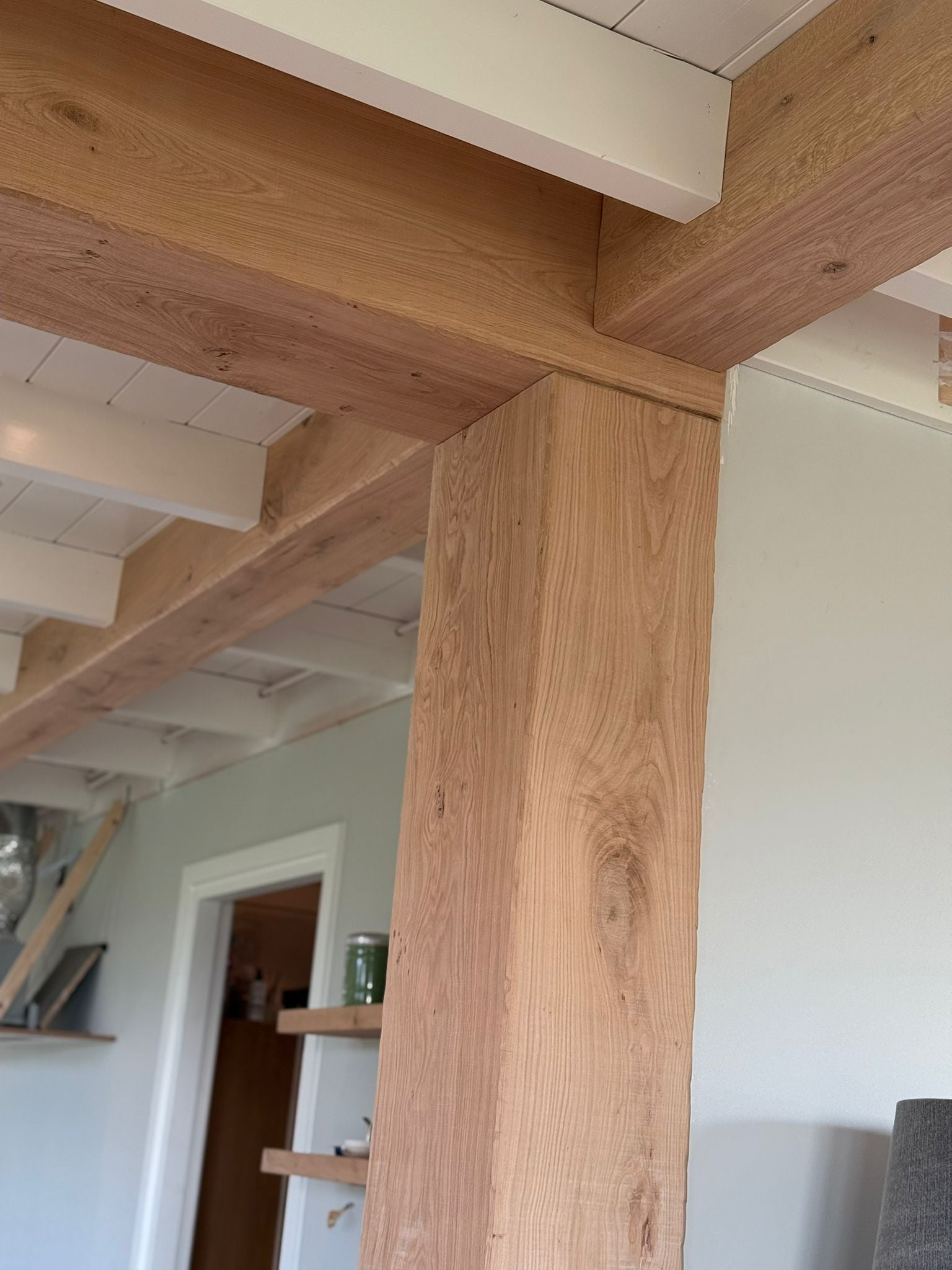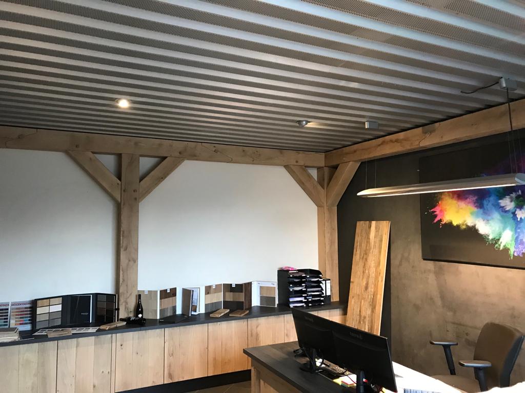 Lelijke metalen draagconstructies worden weggewerkt achter prachtige eiken ‘balken’.